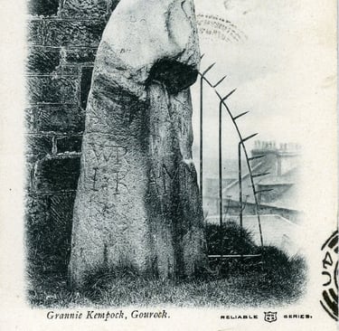 Due to its appearance, locals know the stone as "Granny Kempock" or the "Lang Stane" and stories are told about it once being a witch who was turned to stone. Sailors going on a long voyage or newly married couples would walk around the stone seven times to bring them good fortune.Certainly the appearance gives the impression of an elderly cloaked woman slightly haunched and looking out to sea.