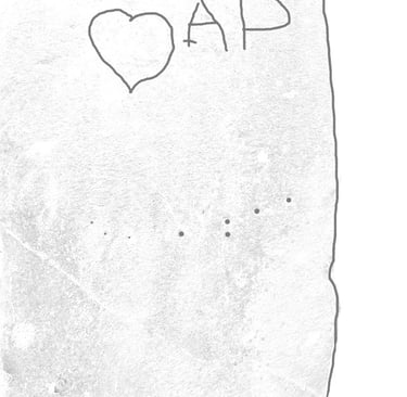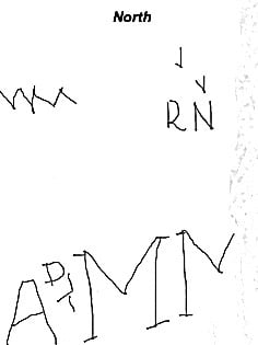 Photographs show the top and bottom half as there are so many marks, however it has a mixture of graffiti and runes. Of curiosity is why the clearly modern initials are boxed with an ancient rune.